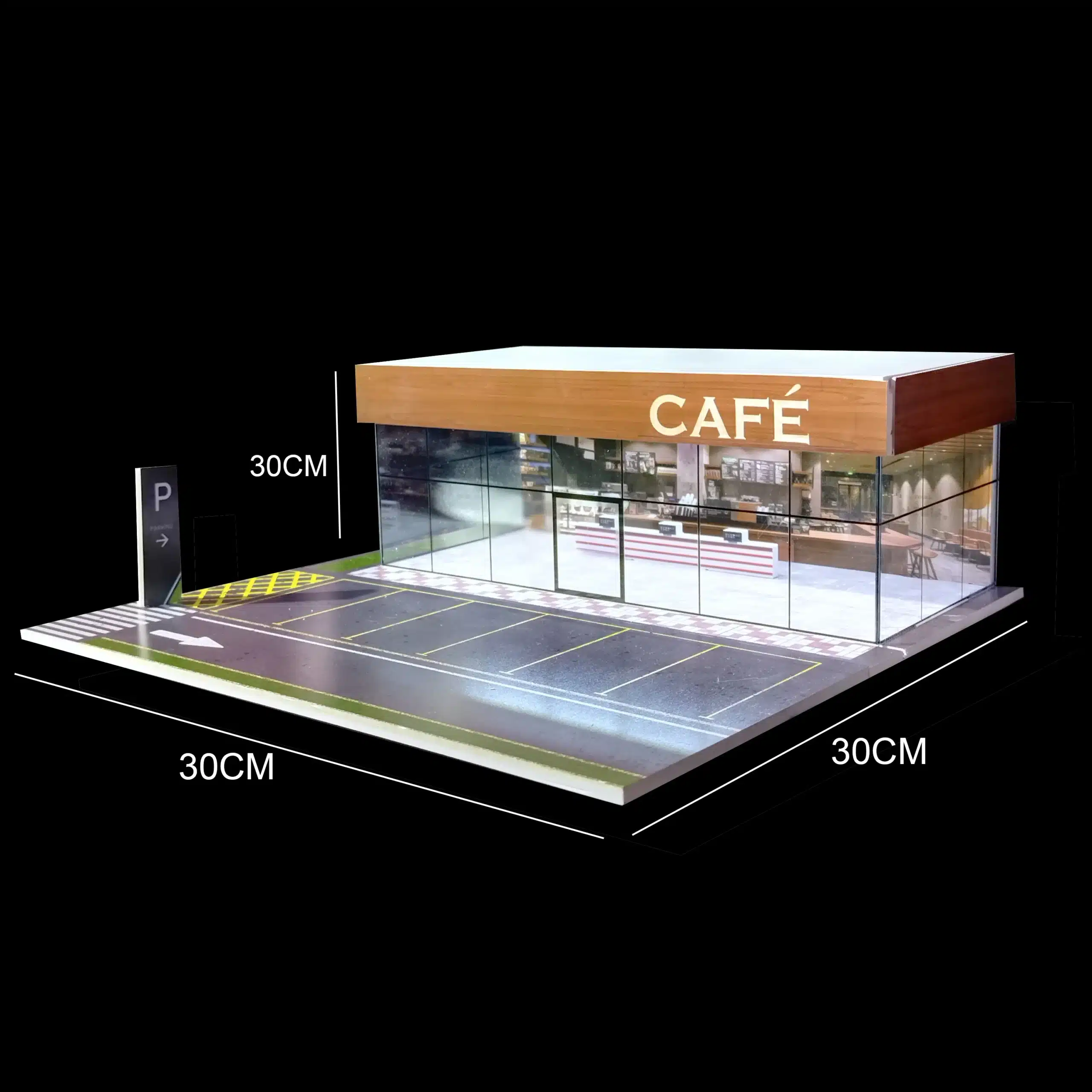 L’intérieur du café miniature avec parking 1/64 révèle un aménagement soigné visible à travers les baies vitrées.