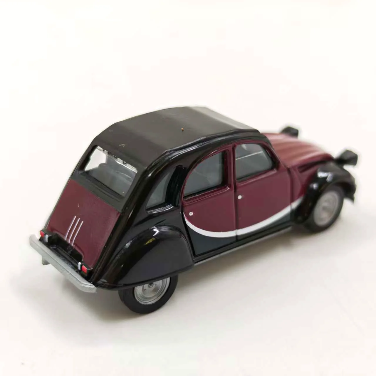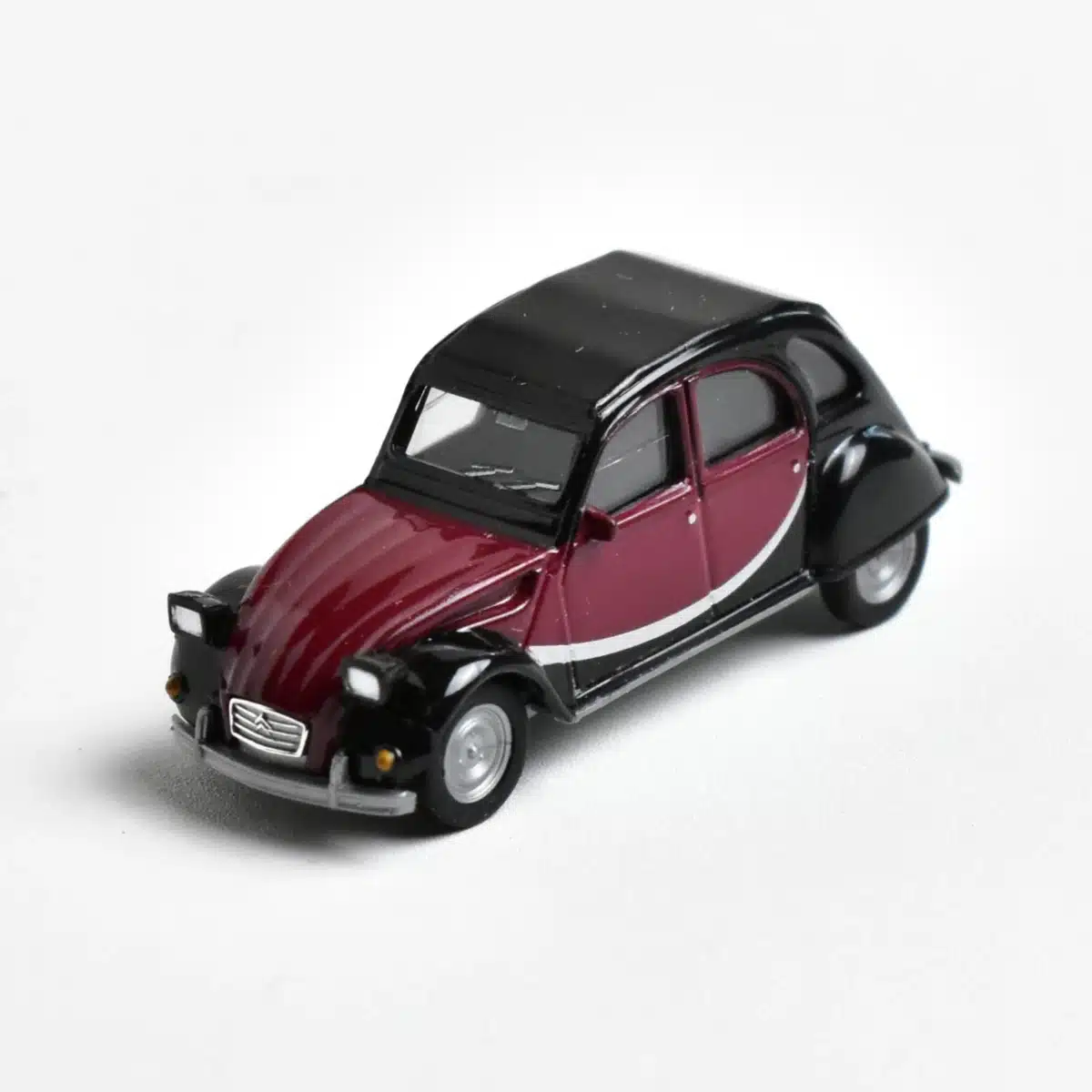 Cette Citroën 2CV miniature reproduit avec une fidélité saisissante l’iconique voiture française dans sa version bicolore bordeaux et noir. La carrosserie arbore cette teinte bordeaux profonde si caractéristique, rehaussée par un toit noir qui contraste parfaitement et donne du caractère à l’ensemble.