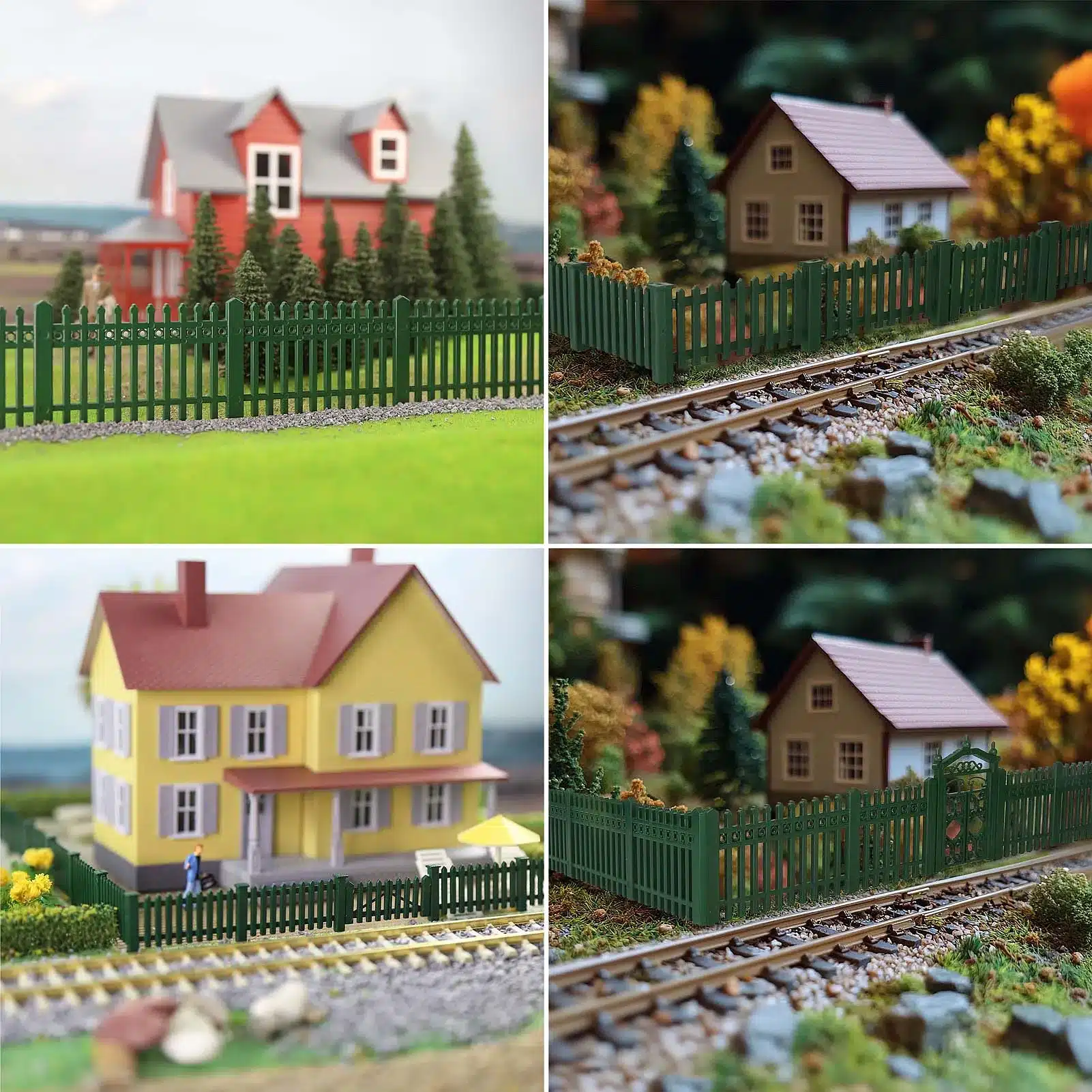 Grâce à sa teinte verte uniforme, cette clôture s’intègre naturellement dans les décors paysagers, les scènes ferroviaires ou les quartiers résidentiels. La couleur met en valeur les pelouses, haies, chemins et massifs floraux sans attirer trop l’œil : elle sert la scène plutôt que de la dominer.