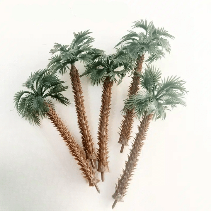Ces cocotiers miniatures pour maquette 11 cm reproduisent avec fidélité l’aspect naturel des palmiers tropicaux. Chaque arbre présente un tronc texturé et élancé qui imite parfaitement l’écorce rugueuse caractéristique des cocotiers réels. Les stries et reliefs du tronc apportent un réalisme saisissant à vos dioramas.