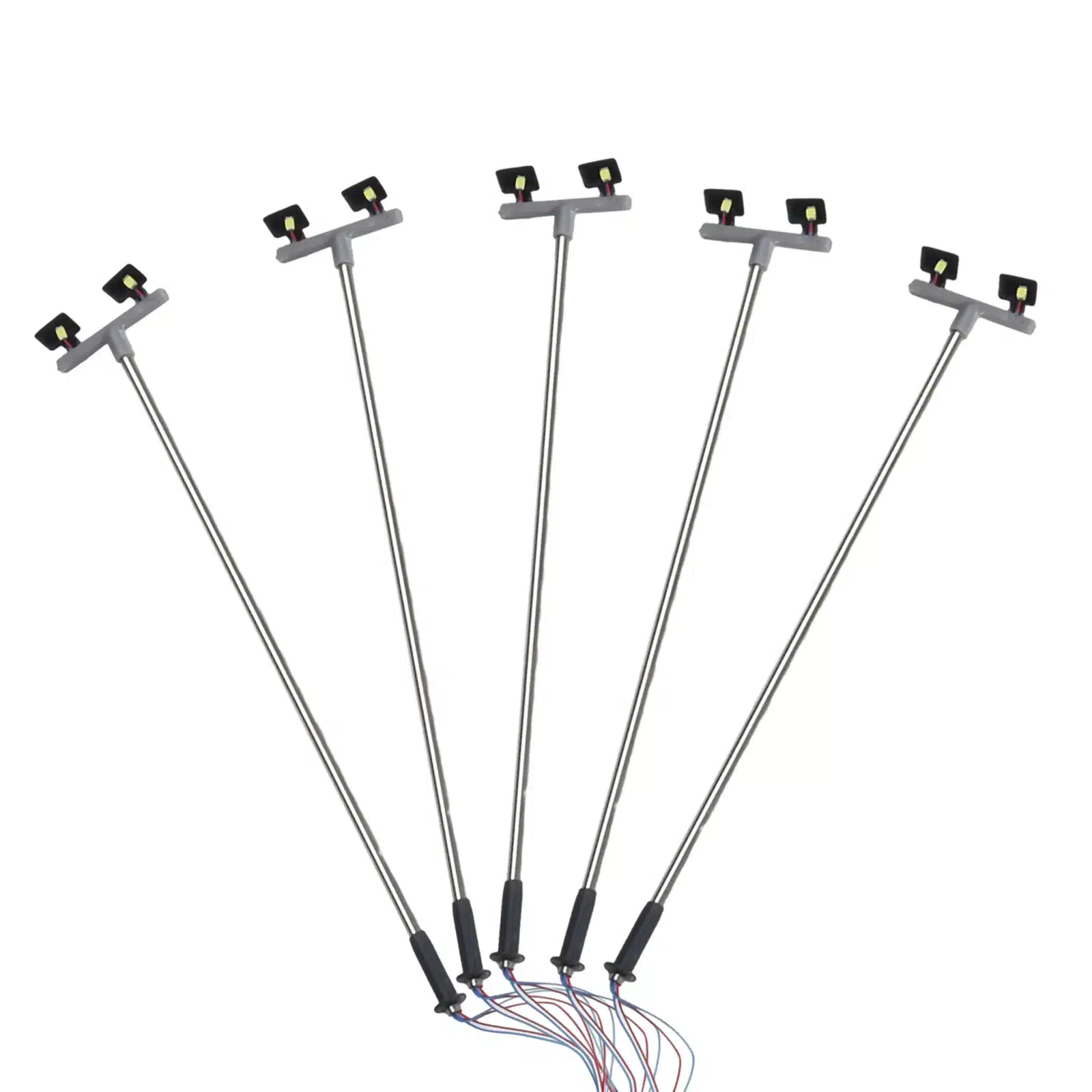 Ce lot comprend 5 mâts d’éclairage, ce qui permet de couvrir une surface assez large et de structurer visuellement une scène. Avec une hauteur d’environ 12 cm, ces lampadaires offrent une grande flexibilité d’intégration. Ils sont particulièrement adaptés aux échelles OO (1/76) et HO (1/87), mais peuvent aussi être utilisés sur d’autres échelles pour représenter des mâts plus ou moins hauts selon le contexte.
