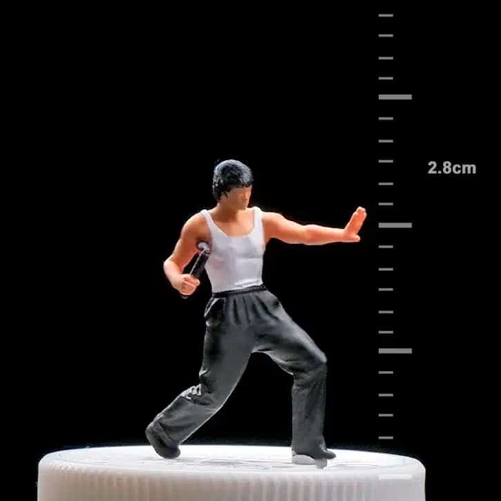 À l’échelle 1/64, cette figurine mesure environ 2,8 cm de hauteur, ce qui la rend parfaitement compatible avec les dioramas urbains, les scènes de rue, les décors contemporains ou les univers inspirés du cinéma et de la culture asiatique. Sa posture de combat, bras tendu en garde et jambes ancrées au sol, donne une vraie sensation de tension et de maîtrise martiale.