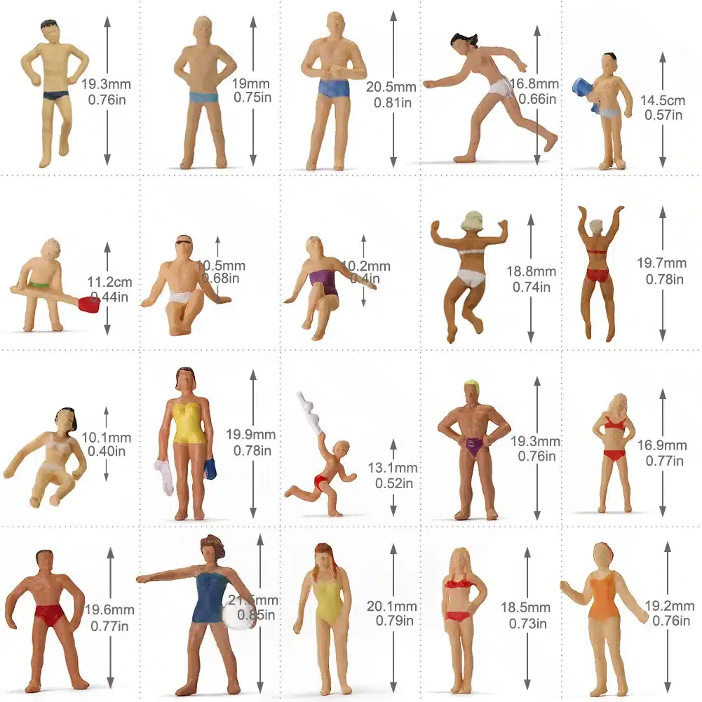 Les figurines sont à l’échelle 1:87, ce qui les rend compatibles avec vos dioramas de ville, de parc ou vos maquettes de trains. Elles s’intègrent parfaitement dans un décor avec une piscine miniature, un lac ou un bord de mer.