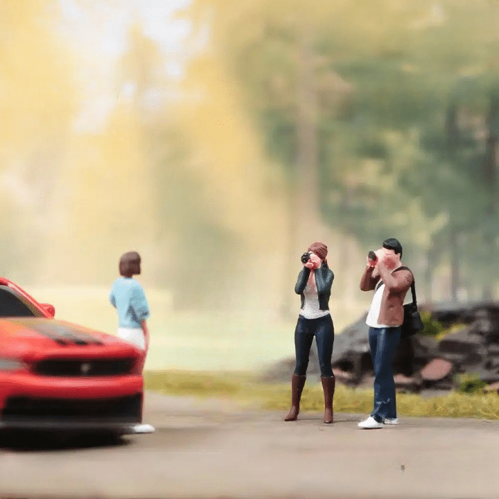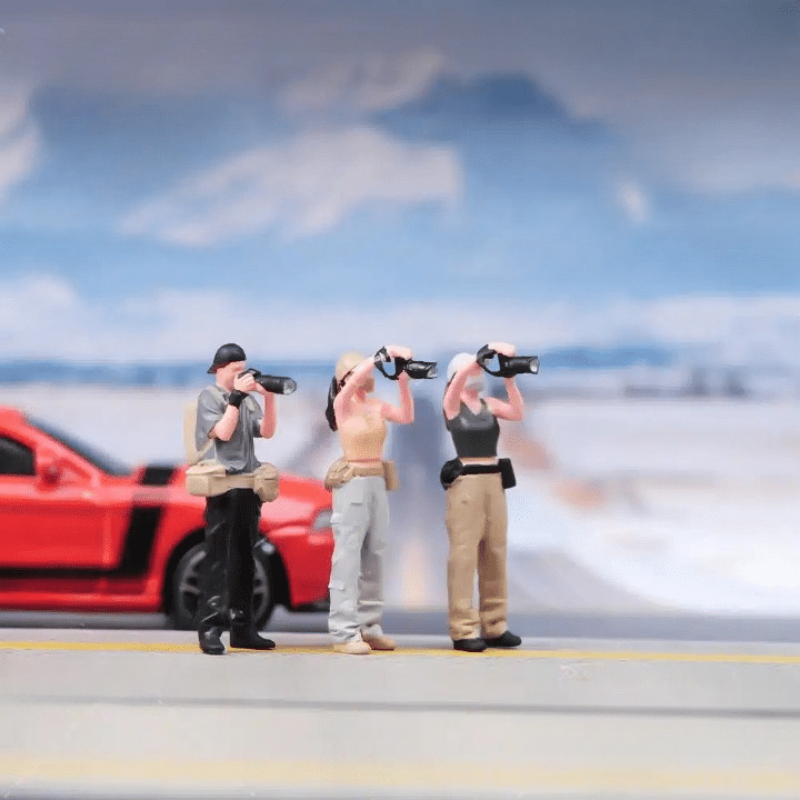 Voici une sélection de figurines photographes à l’échelle 1/64, peintes avec soin et prêtes à l’emploi pour offrir un rendu réaliste.