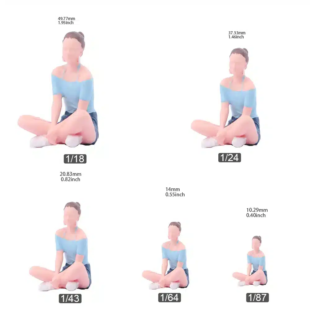 Cette figurine miniature femme assise en tailleur est proposée en trois modèles distincts. Deux versions sont entièrement peintes : l’une avec un t-shirt bleu, l’autre avec un t-shirt noir, chacune apportant une ambiance différente selon le décor. Une troisième version est proposée sans peinture, idéale pour les modélistes souhaitant personnaliser la figurine selon leurs propres couleurs ou styles.