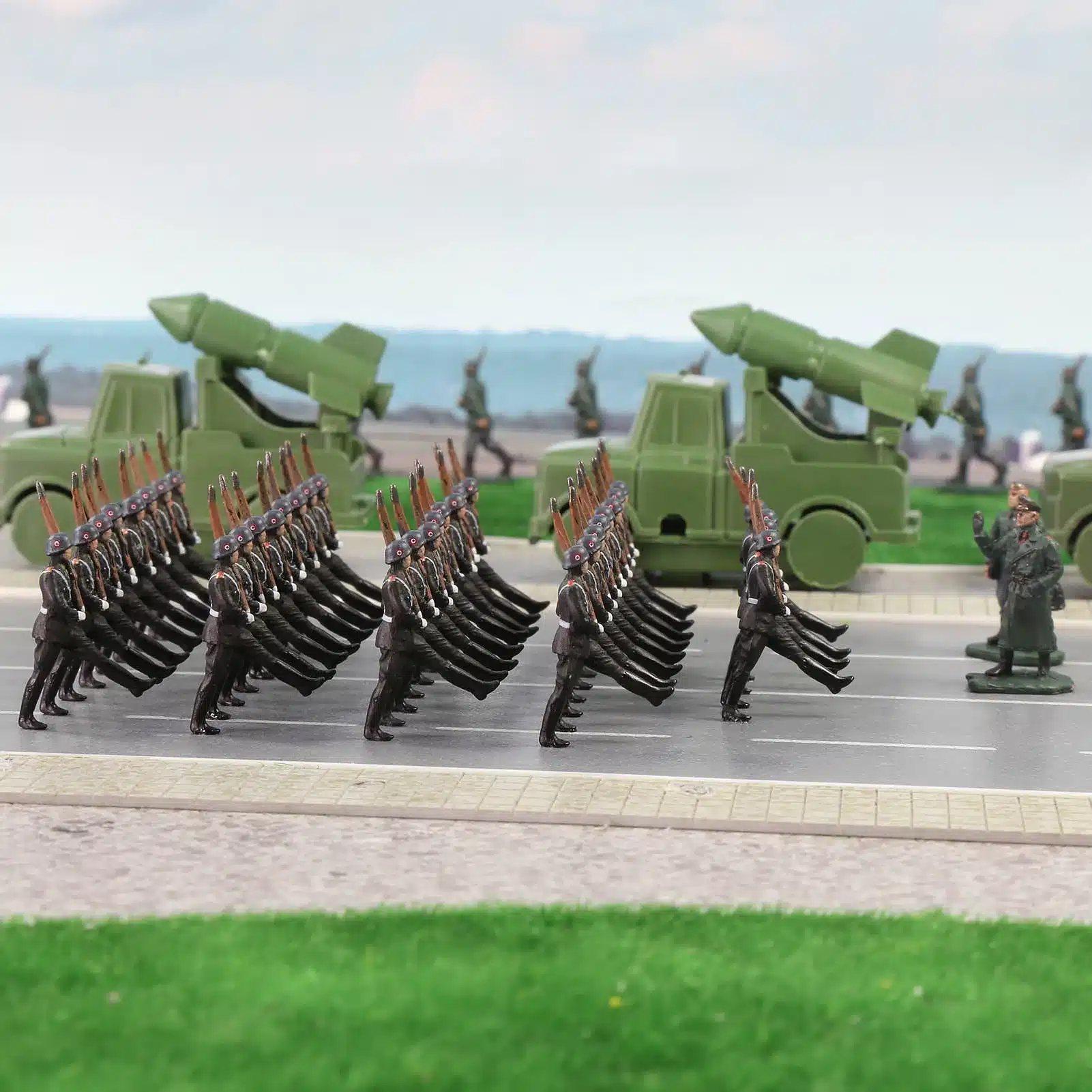 Ces figurines militaires à l’échelle 1/87 représentant des troupes en marche et en plein défilé reproduisent avec un réalisme saisissant des soldats en formation de parade.