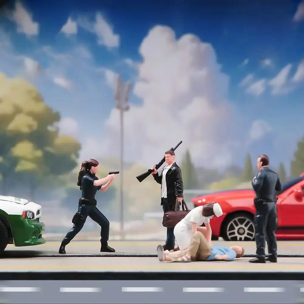 Les poses dynamiques créent un vrai mouvement dans ton décor. Entre l’agent en position de tir, le suspect à terre, le secouriste et les policiers en intervention, chaque figurine raconte quelque chose.