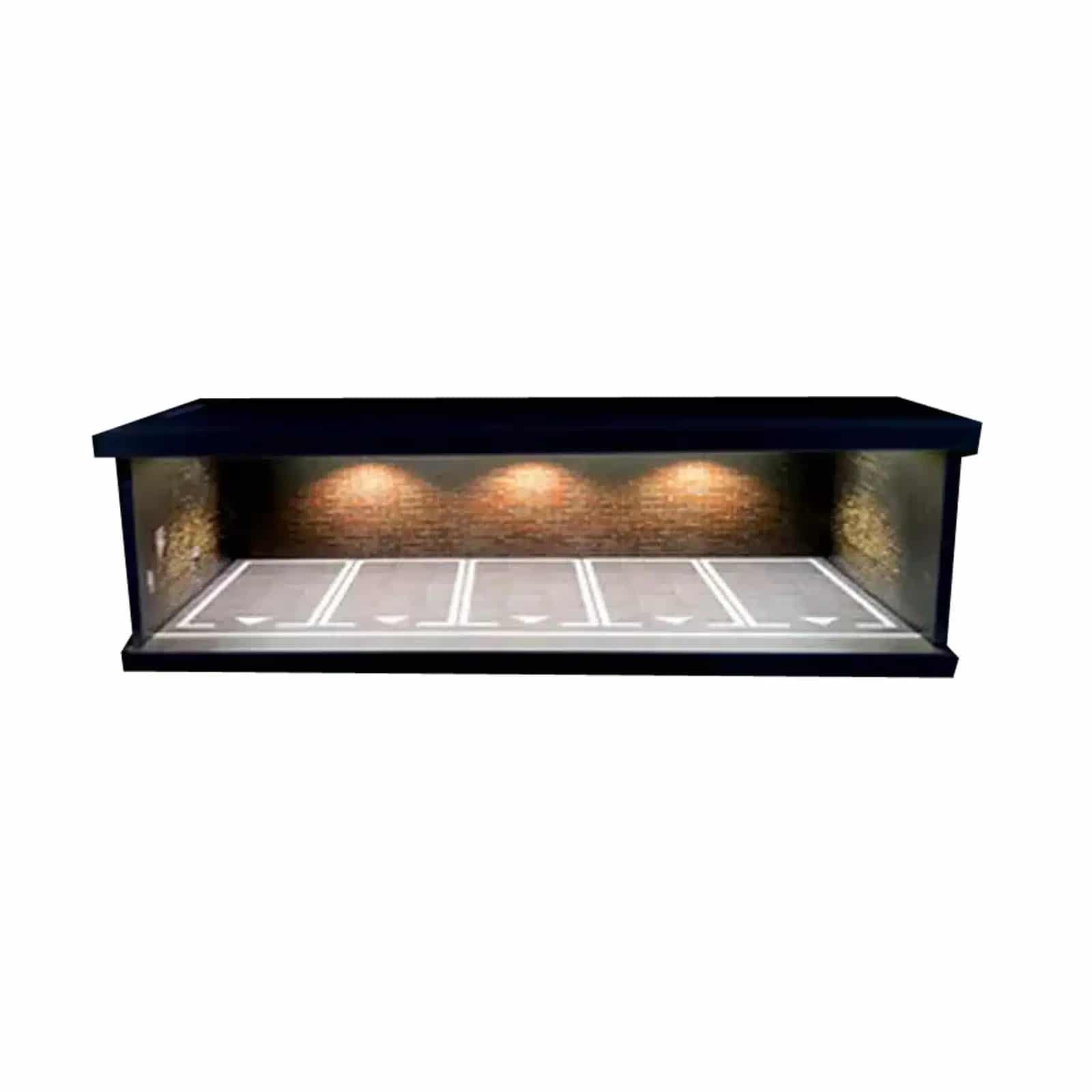 Les éclairages intégrés dans certaines sections créent une ambiance authentique et mettent en valeur l’intérieur du garage miniature 1/43.