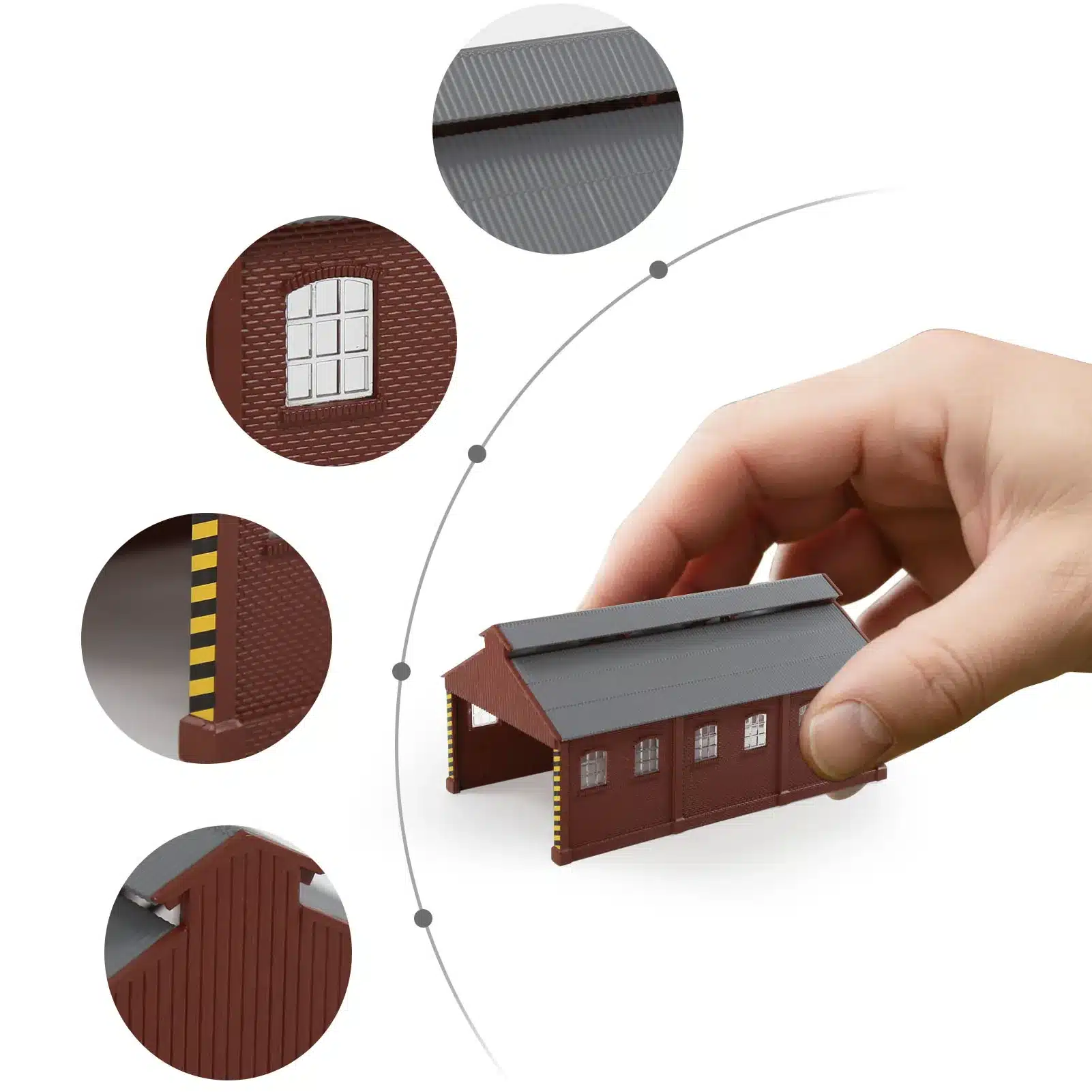 Ce hangar ferroviaire à l’échelle N (1/160) est conçu pour ajouter un véritable point d’exploitation à votre réseau miniature. Son muret en briques rouges, sa toiture gris foncé et ses fenêtres industrielles reproduisent fidèlement l’architecture des dépôts ferroviaires européens.