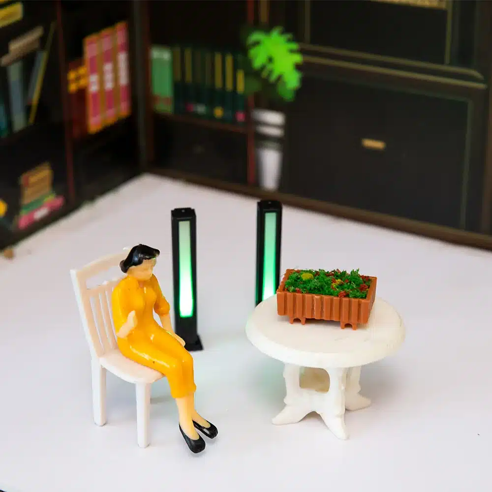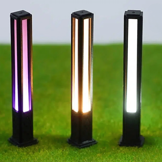 Ces lampes de jardin LED pour maquette 1/100 reproduisent fidèlement l’éclairage urbain moderne avec un réalisme saisissant. Le design cylindrique élancé se termine par une base solide qui assure une stabilité parfaite sur vos dioramas.