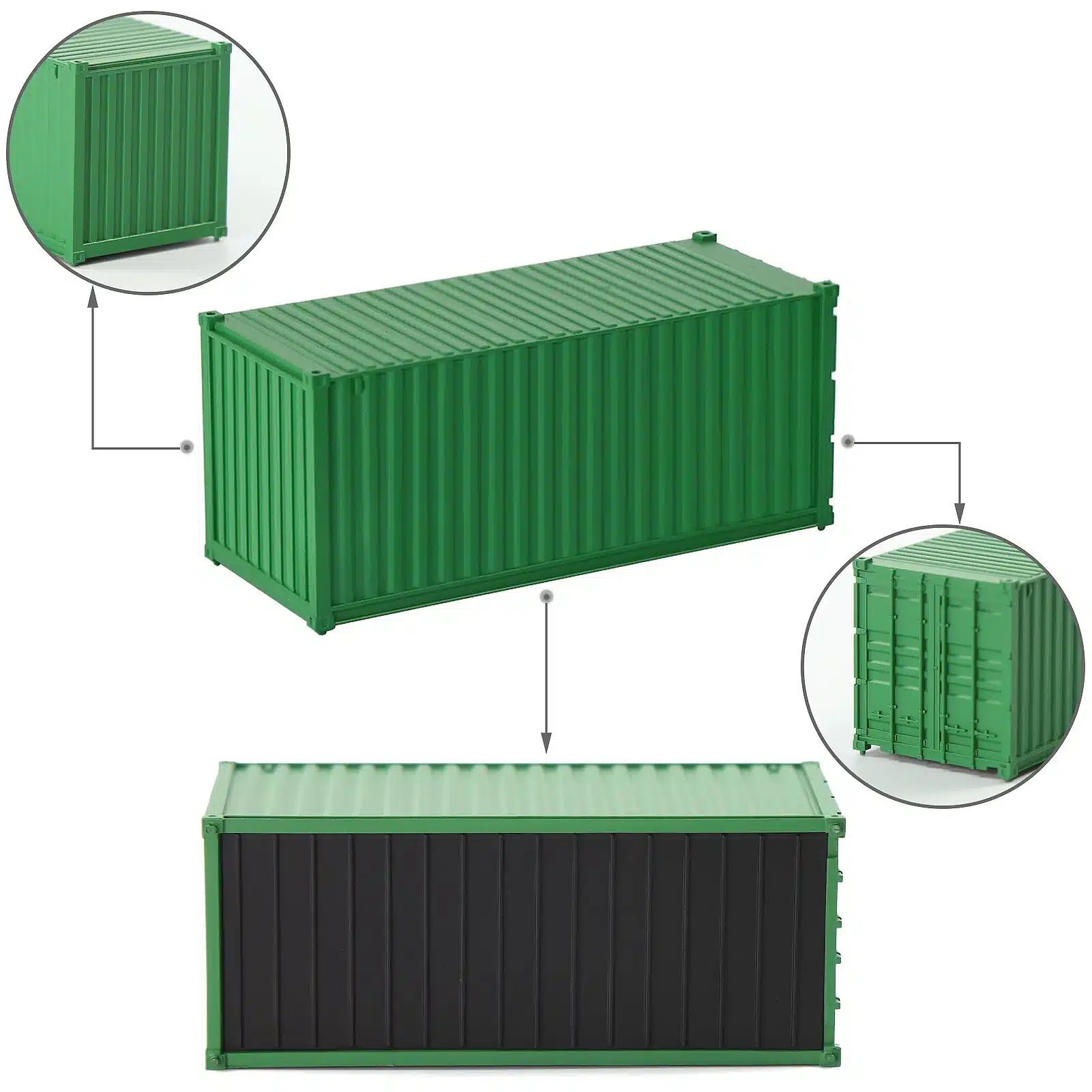 Chaque conteneur affiche une finition mate qui évite les reflets disgracieux sous l’éclairage de votre réseau. Les faces latérales identiques respectent l’uniformité des containers maritimes authentiques.
