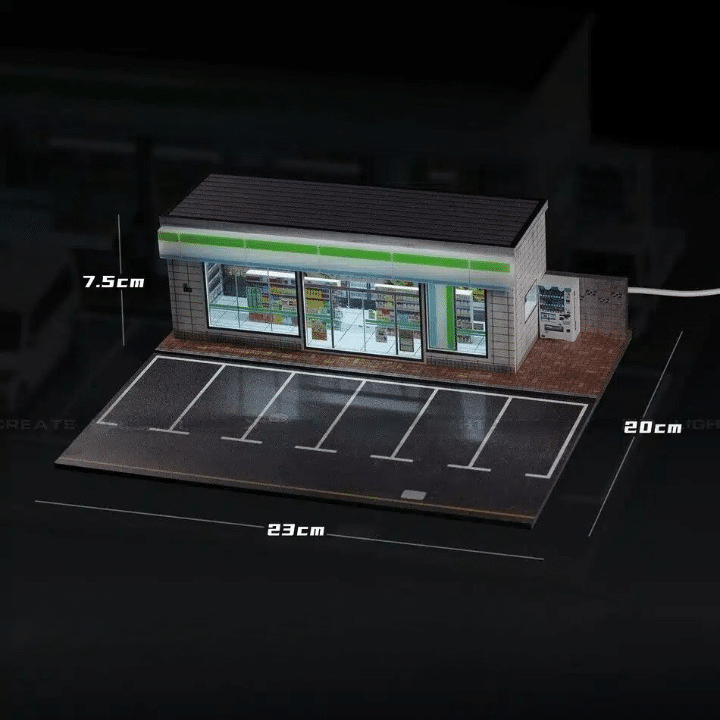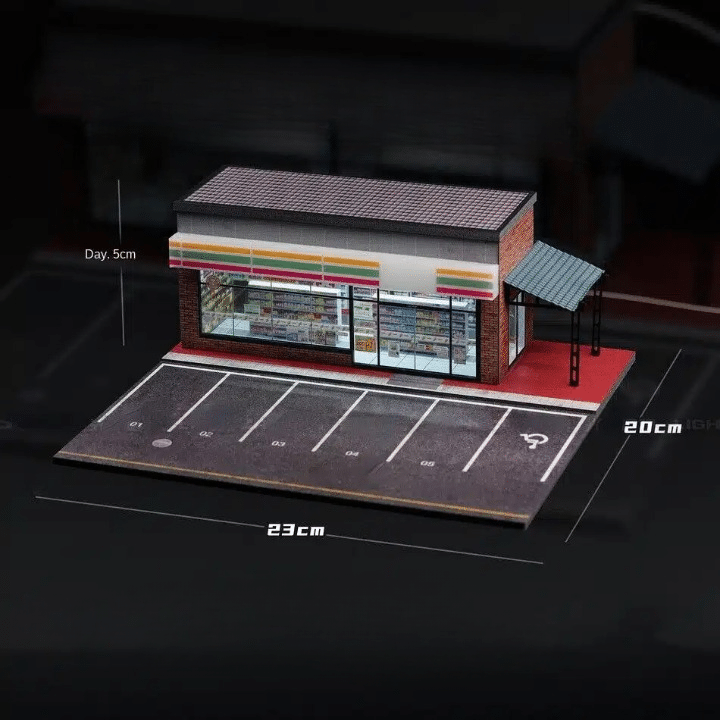 L’ensemble architectural de cette maquette de supérette 1/64 avec parking dégage une impression de modernité grâce à ses lignes épurées et sa conception soignée.