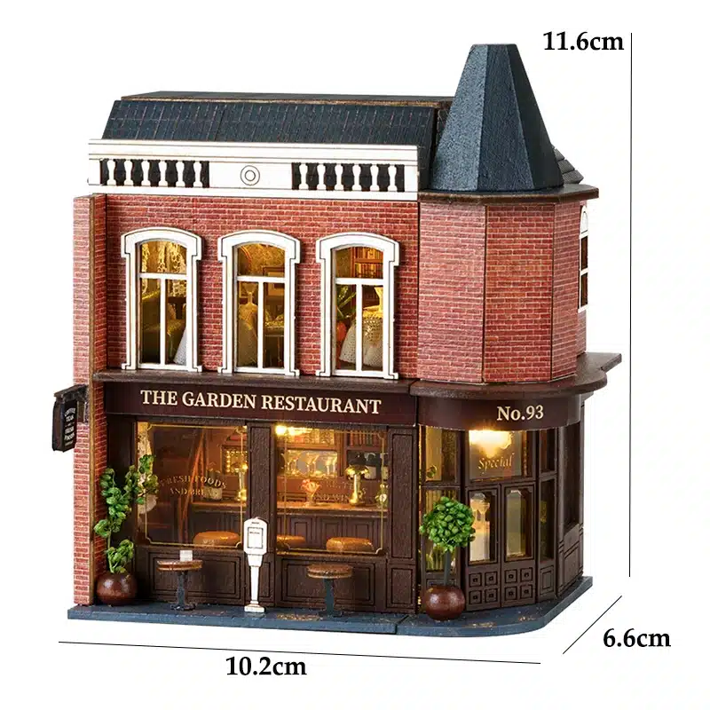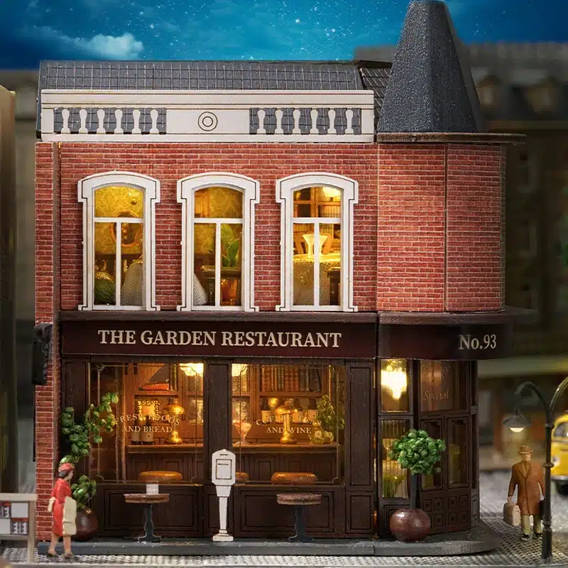 Que ce soit pour compléter une scène de ville miniature ou comme pièce maîtresse d’une vitrine, cette maquette de maison-restaurant transforme n’importe quel espace d’exposition en véritable quartier vivant.