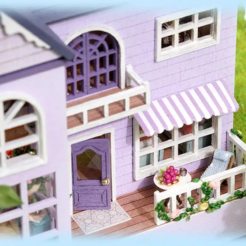 La maquette de maison violette se distingue par ses finitions exceptionnelles, des tuiles du toit aux détails des fenêtres éclairées qui créent une ambiance chaleureuse.