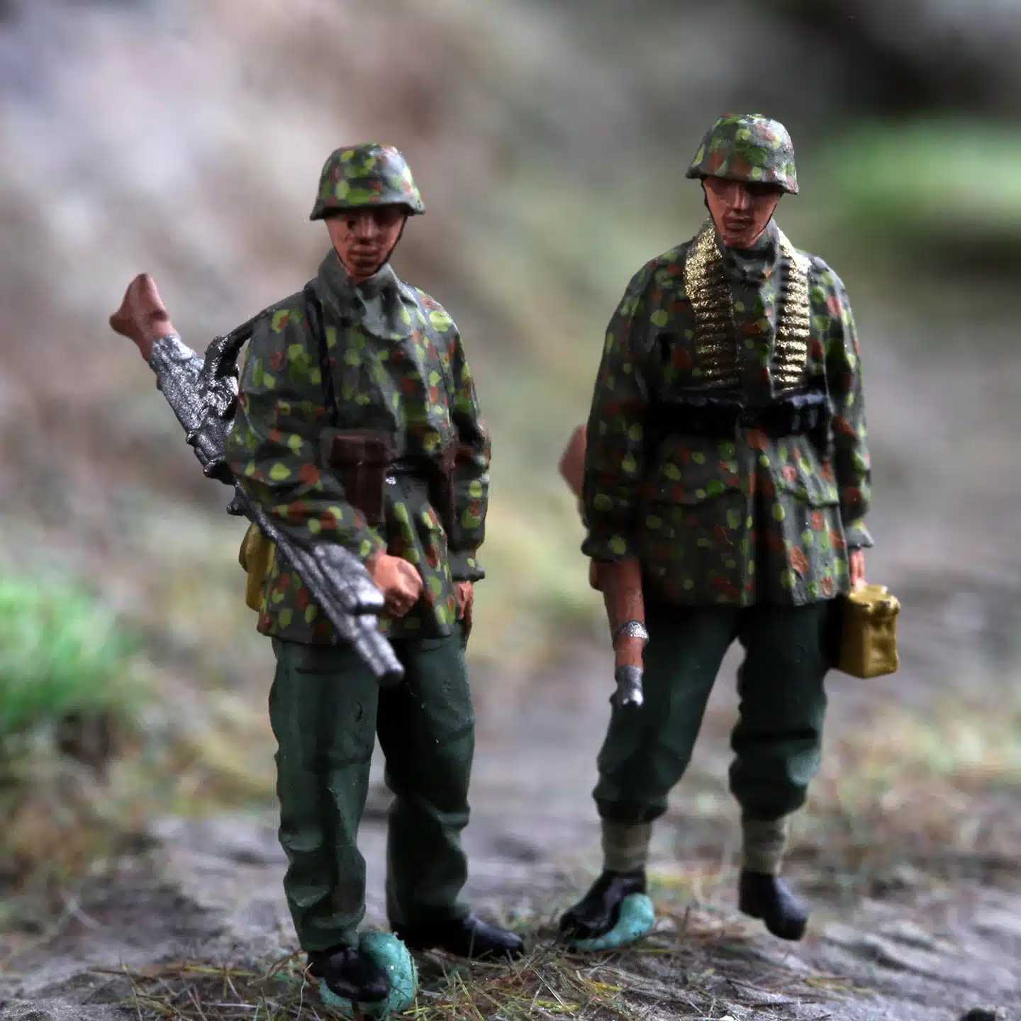 Cette maquette représente deux soldats allemands avec des détails remarquablement précis qui captent immédiatement l’attention.