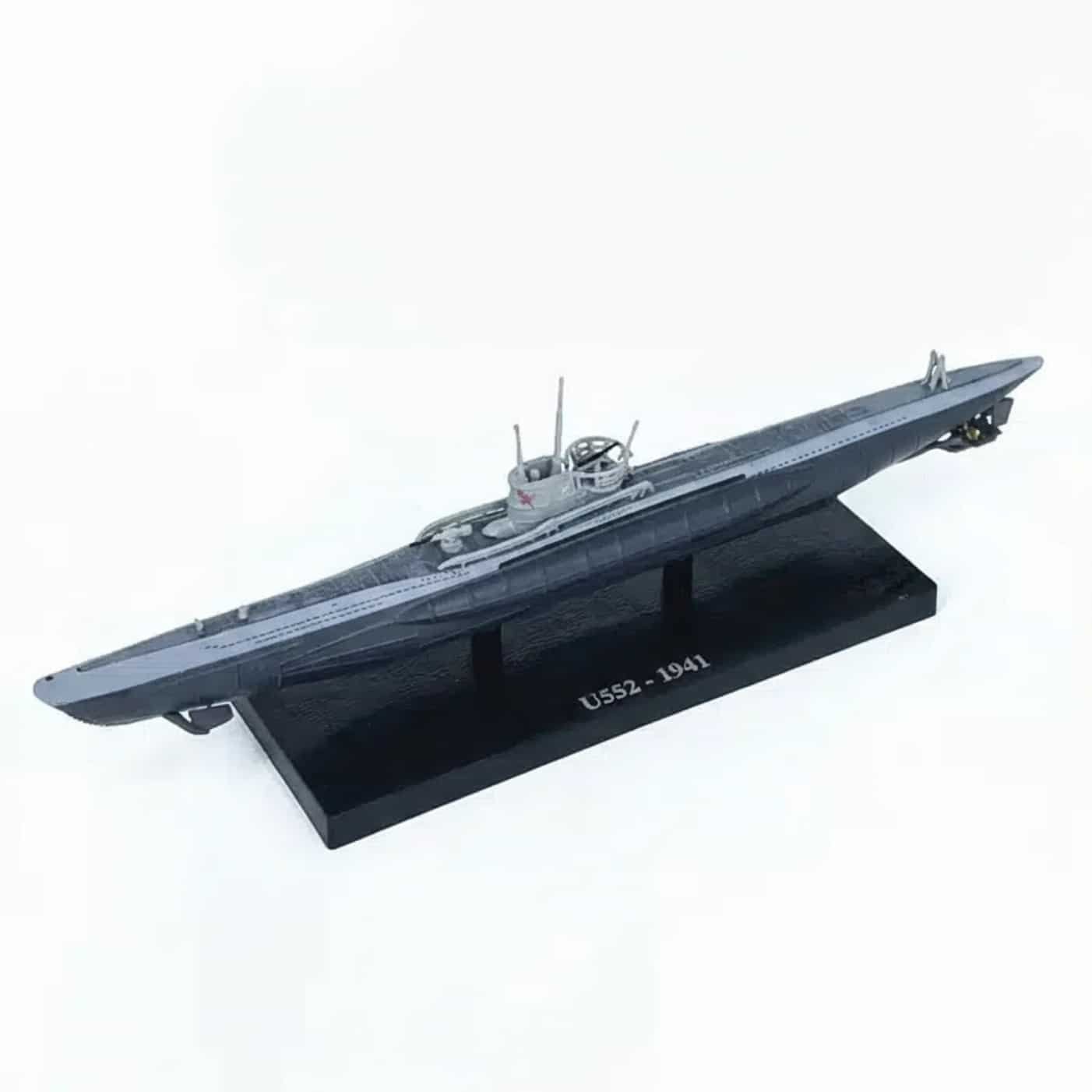 Cette maquette u-552 repose sur un socle noir élégant qui met en valeur la silhouette du submersible. Le rendu des surfaces présente une texture uniforme qui simule l’aspect métallique de la coque d’origine.