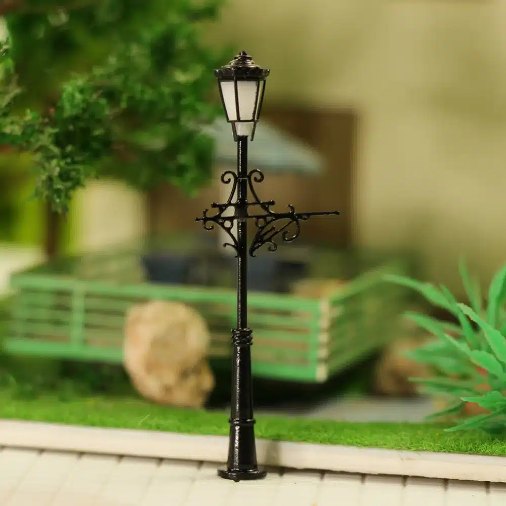 La finition soignée de ces mini-lampadaire led 1/160 révèle des détails remarquables. Les motifs sculptés sur les bras latéraux imitent parfaitement les ferronneries traditionnelles. La base circulaire stable assure un positionnement parfait sur vos dioramas urbains.