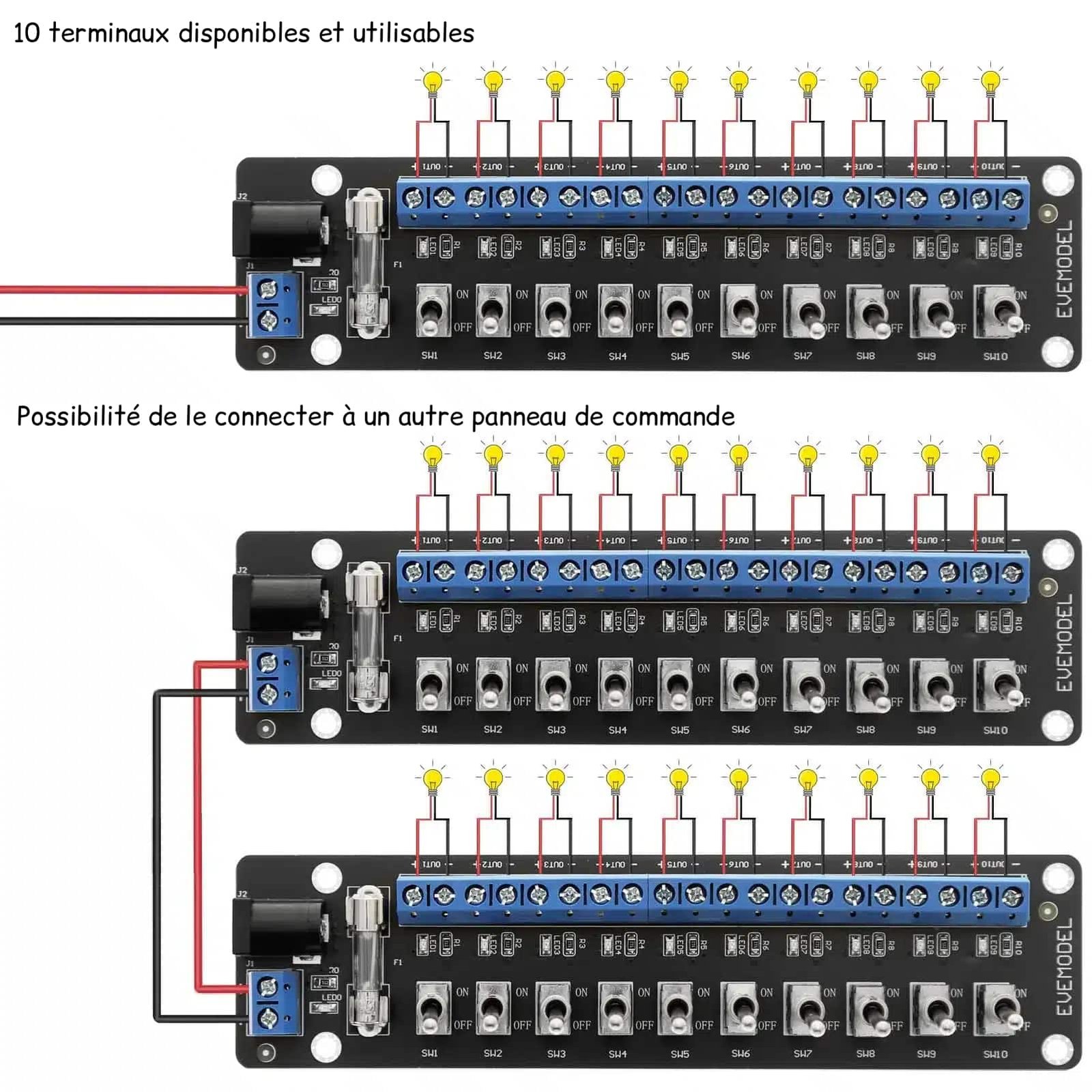 Ce panneau commande électrique 10 canaux intègre des bornes de raccordement aux extrémités, détail technique qui renforce le réalisme de l’ensemble. Les composants électroniques miniatures soudés sur la carte ajoutent une dimension technique authentique, reproduisant l’aspect complexe des vrais systèmes de contrôle.