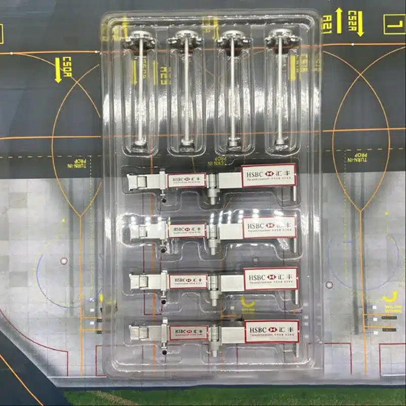 Les finitions métallisées et les surfaces transparentes donnent à cette passerelle d’embarquement miniature une authenticité remarquable, tandis que les détails techniques comme les joints d’étanchéité et les systèmes de connexion sont reproduits avec précision.