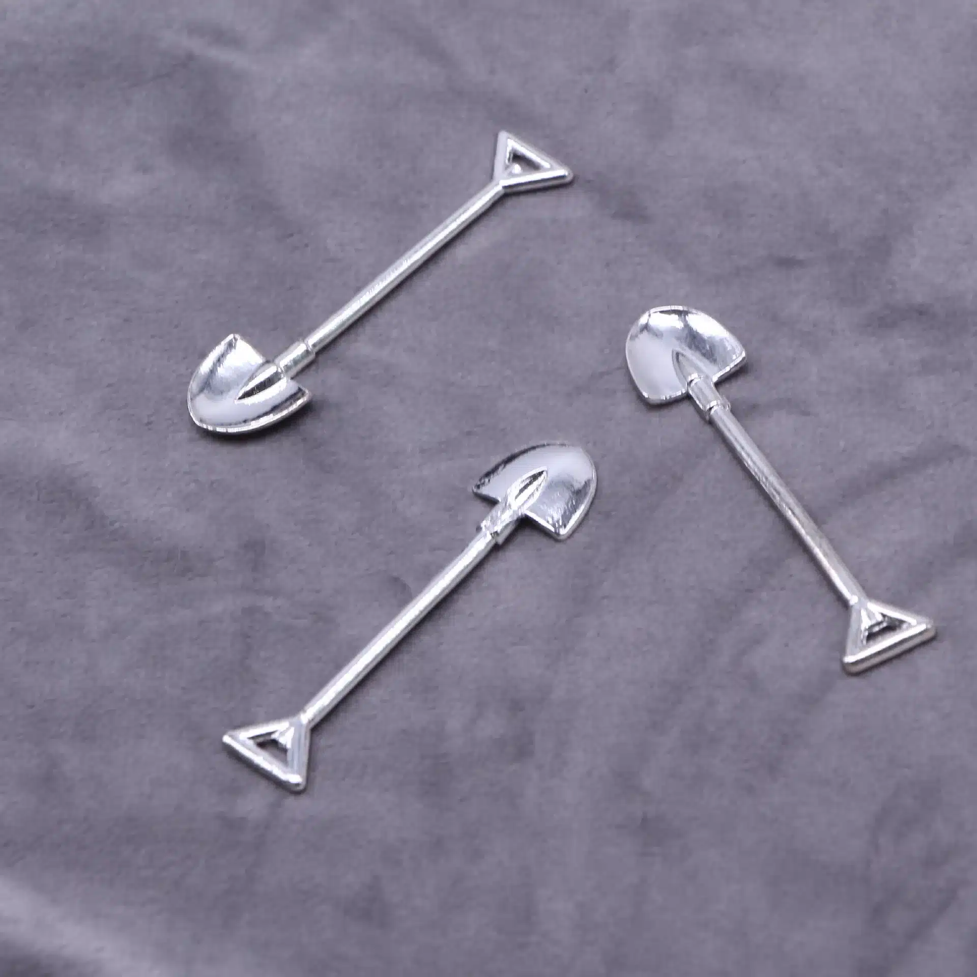 Le manche long et fin de chaque pelle miniature affiche une finition soignée qui capture l’aspect authentique des manches d’outils professionnels. La poignée triangulaire située à l’extrémité reprend la forme caractéristique des vraies pelles, offrant un rendu visuel convaincant.