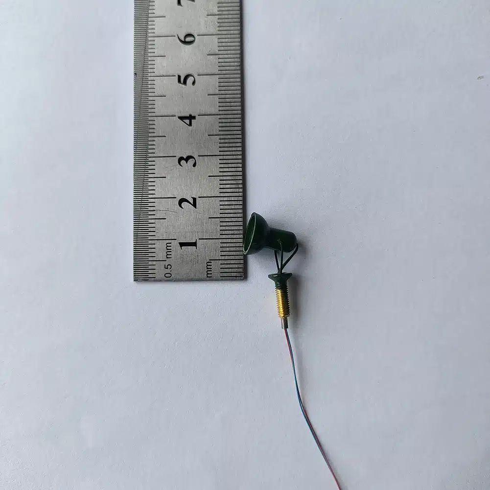 Le spot mesure environ 25 mm, en comptant la tête et la partie destinée à être plantée dans le sol. Ce format permet de l’installer facilement sur une base de diorama, dans du polystyrène, du liège ou un support texturé. La tige facilite l’ancrage et aide à orienter la lumière sans compliquer la mise en place.