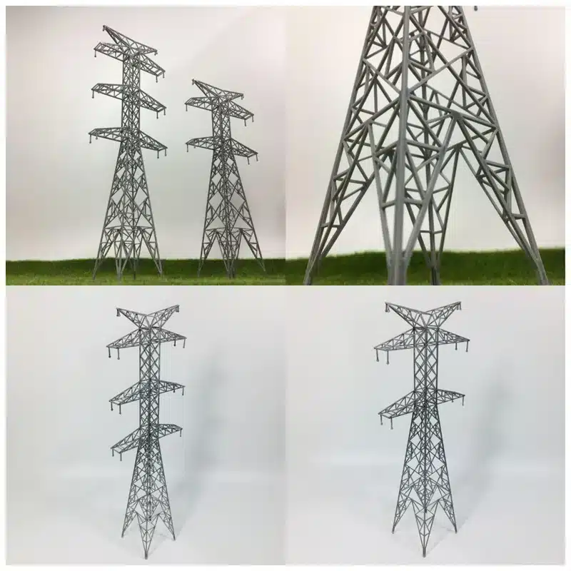 Ces pylônes électriques pour miniatures ferroviaires à l’échelle Z/ZZ reproduisent avec une précision remarquable l’architecture des lignes haute tension que l’on trouve le long des voies ferrées.