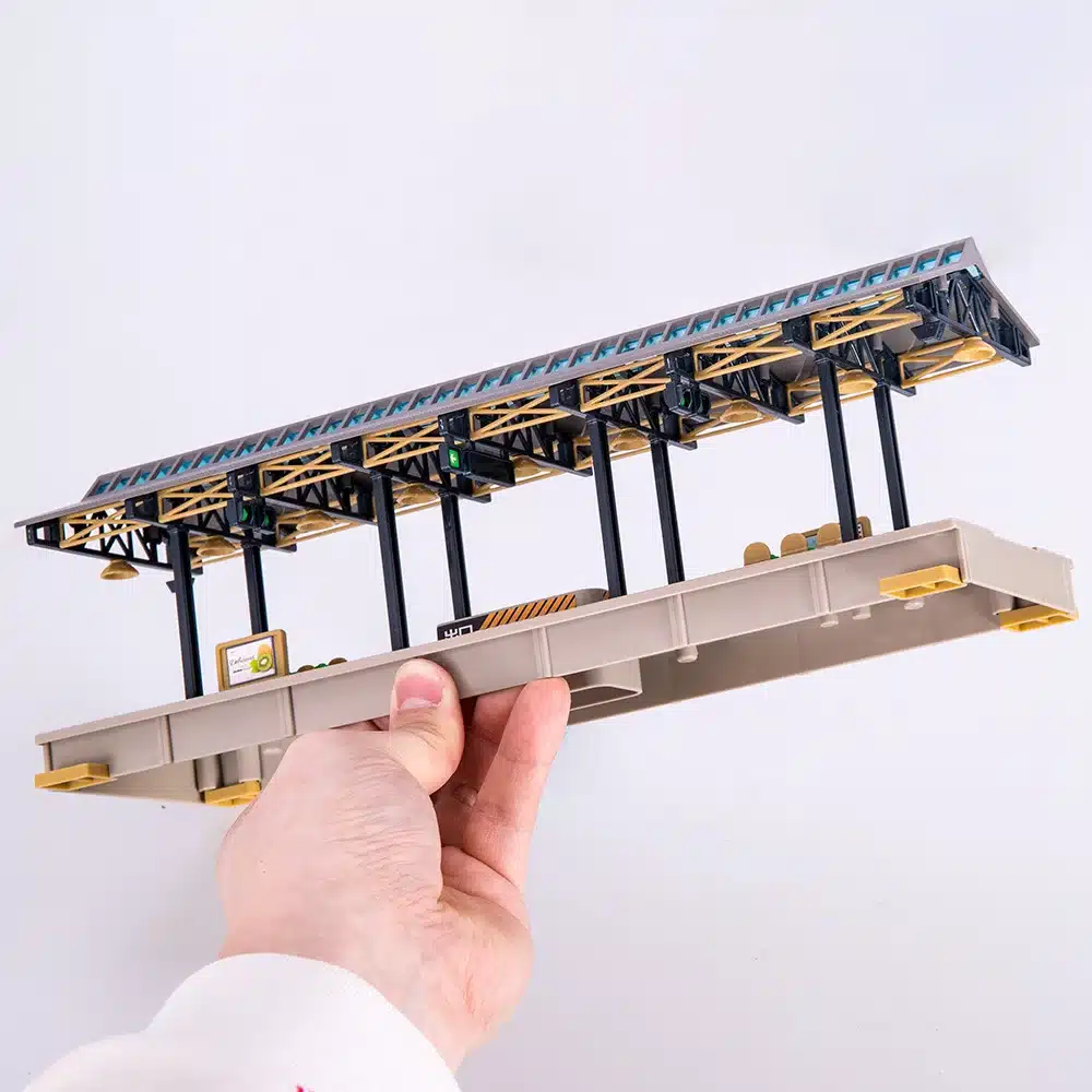 Cette structure de quai de gare diorama HO reproduit fidèlement l’atmosphère des gares d’époque avec ses détails soignés et son architecture caractéristique. La marquise métallique présente une structure en treillis parfaitement détaillée, avec des poutres apparentes qui créent un effet visuel saisissant.