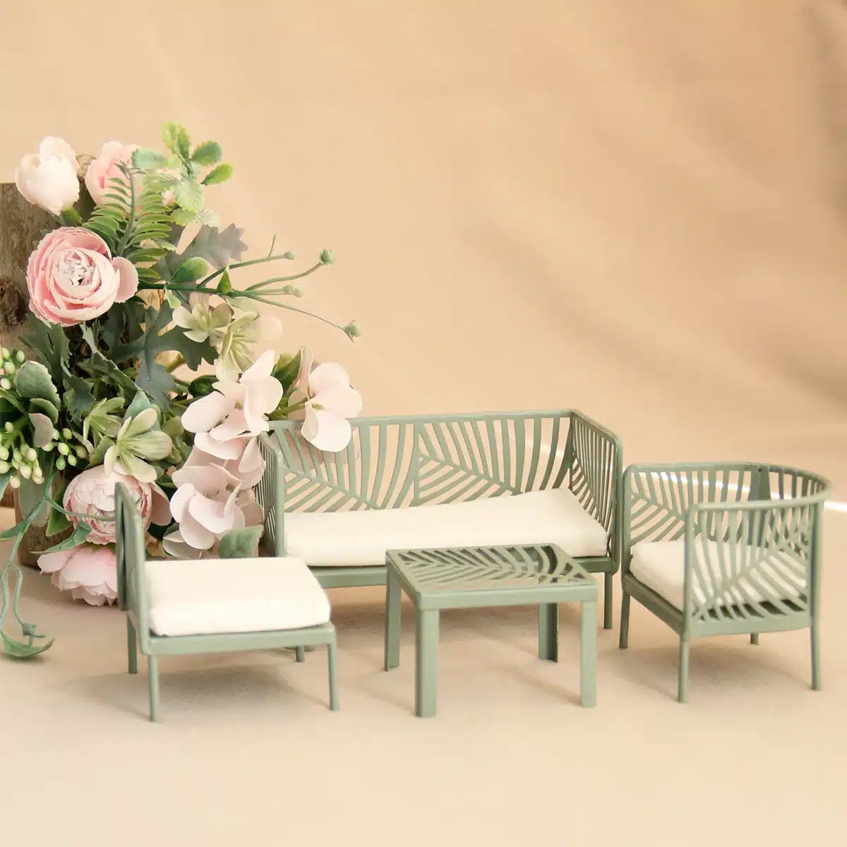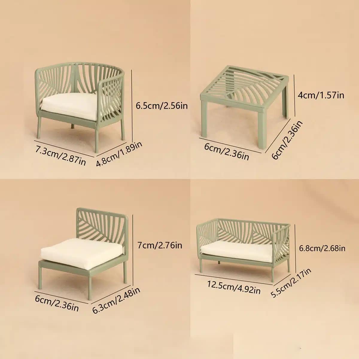 L’ensemble complet comprend un canapé deux places, deux fauteuils assortis et une table basse, tous dans une teinte verte apaisante qui évoque parfaitement l’ambiance jardin. Les coussins blancs créent un contraste élégant et apportent une touche de fraîcheur réaliste à ce mobilier d’extérieur miniature.