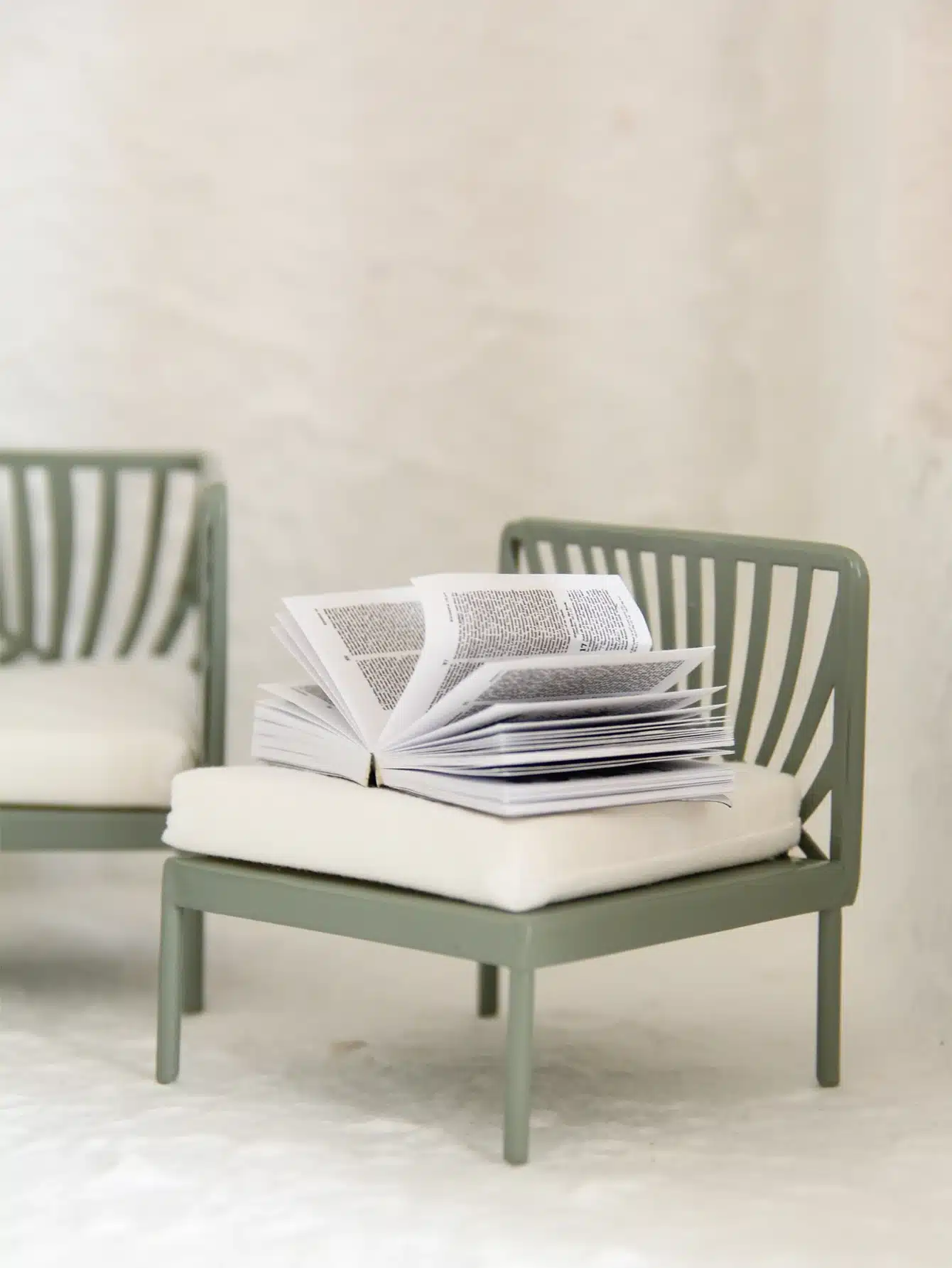 Les lignes épurées et modernes de ce salon pour jardin miniature vert s’inspirent du mobilier contemporain que l’on trouve dans nos vraies terrasses. Les dossiers ajourés et la structure fine donnent une impression de légèreté tout en conservant un aspect robuste et authentique.