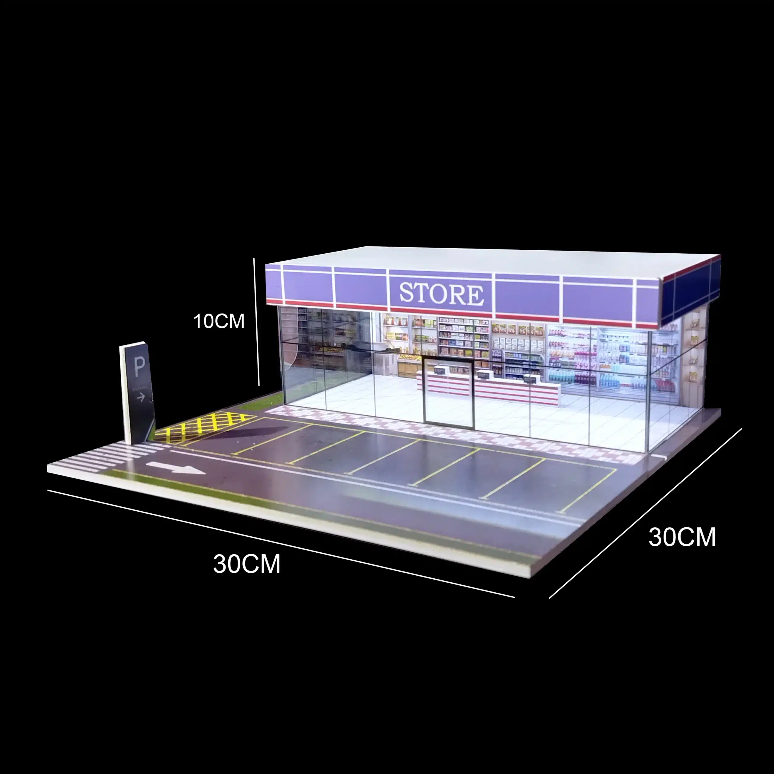 Ce supermarché miniature avec parking 1/64 reproduit fidèlement l’architecture moderne des centres commerciaux contemporains. La façade présente des tons violets et blancs qui créent un contraste visuel saisissant, tandis que les grandes baies vitrées transparentes laissent apercevoir l’intérieur du magasin.