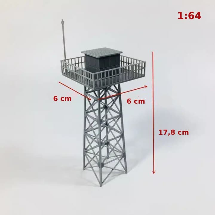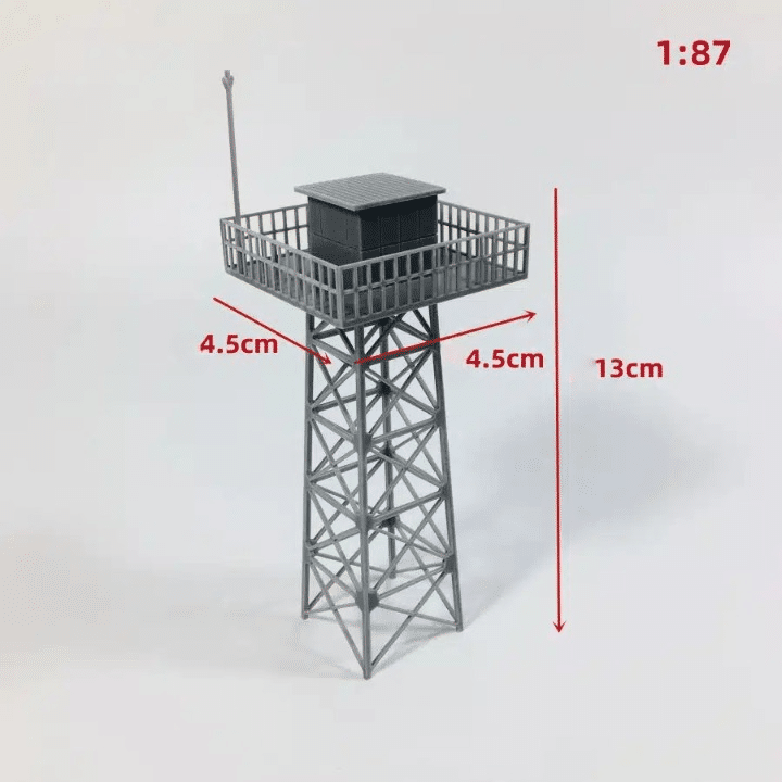 Cette tour de garde pour diorama échelle S/HO reproduit avec précision l’architecture typique des postes d’observation militaires ou frontaliers. La structure métallique grise présente un treillis détaillé qui imite parfaitement les poutrelles d’acier des vraies constructions industrielles.