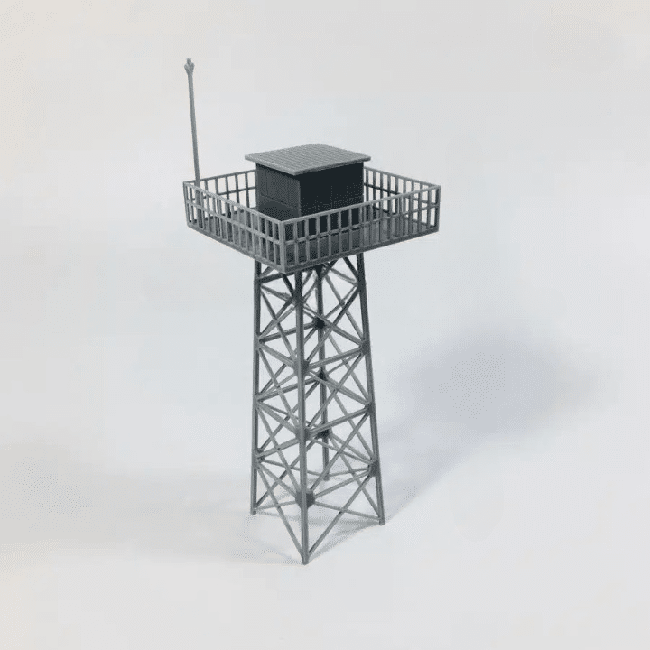 Le pylône de support triangulaire montre un assemblage de poutrelles entrecroisées qui confère une impression de solidité et d’authenticité remarquable. Chaque élément structurel est finement modelé pour reproduire les détails techniques des véritables tours de guet.